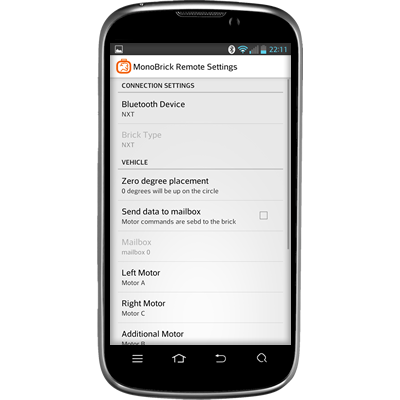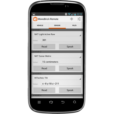 The MonoBrick remote for android uses a Bluetooth connection and let’s you control the direction and speed of a vehicle by placing your finger on a circle. While driving you can make the phone “read” sensor values aloud. Furthermore the remote let’s you can play sound files, start “on brick” programs and delete files, and last but not least the remote allows you to send raw user input to a mailbox of your choice. This allows you to have a program running on the brick that can react to where the finger is placed on the circle as well as the position of the slider. Read more here. I hope that you enjoy!